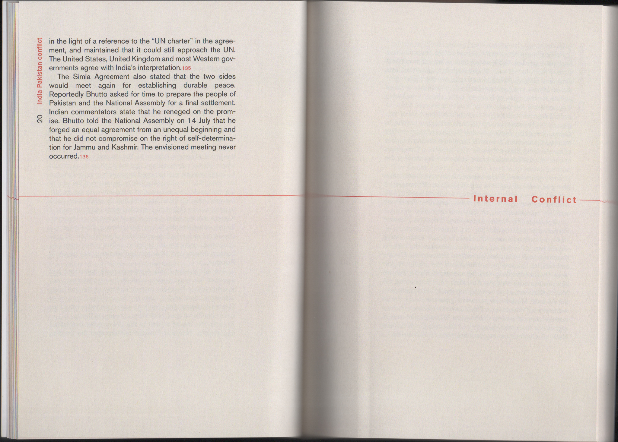 This book uses Wikipedia text that presents the history of Kashmir in the midst of conflict (either cultural/territorial), that in a way has its own voice—either biased, factual or both. Consolidated with several footnotes and sources, pointing to other perspectives in time.