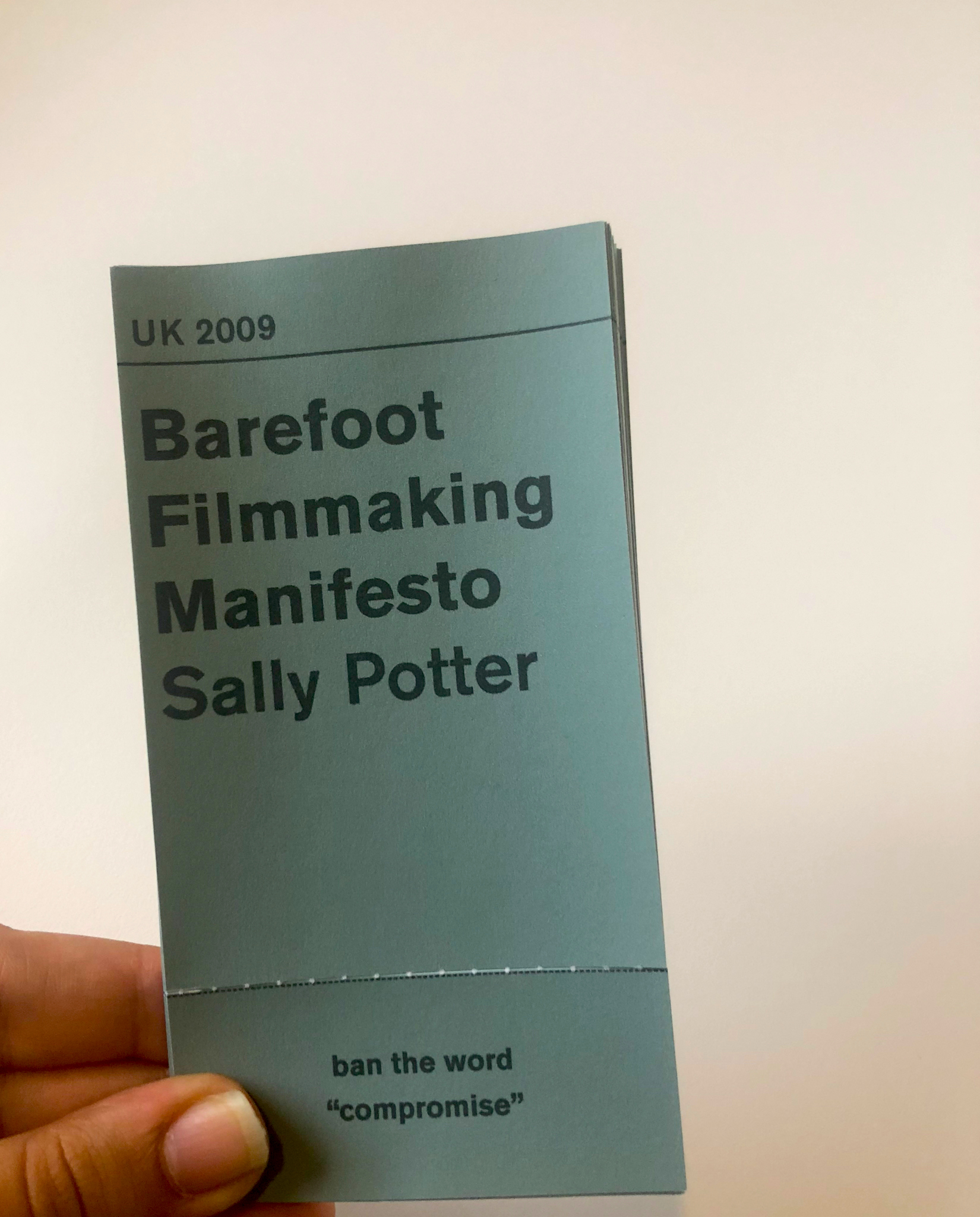 Manifesto design of Sally Potter’s barefoot filmmaking manifesto. The manifesto is divided into small cards, allowing circulation and distribution of the words. The design resembles the style of film tickets with perforated tear-away stubs.